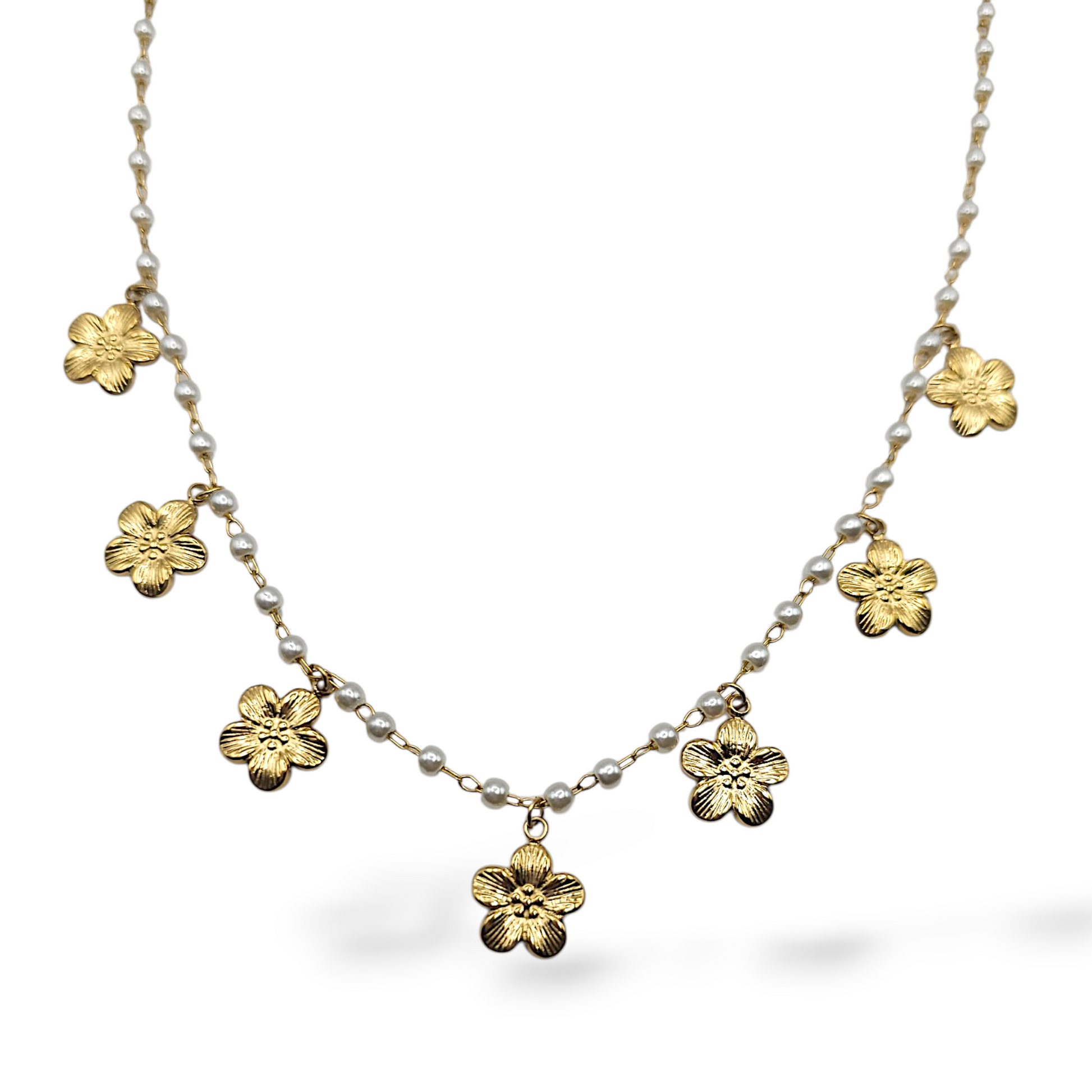 Collier délicat en acier inoxydable 316L, alliant élégance et durabilité. Ce bijou présente une breloque ornée de fleurs délicatement travaillées, agrémentée d'une perle subtile qui ajoute une touche de raffinement. La chaîne ajustable de 45+5 cm s'adapte à tous les cous, offrant une flexibilité de port au quotidien ou pour les occasions spéciales.