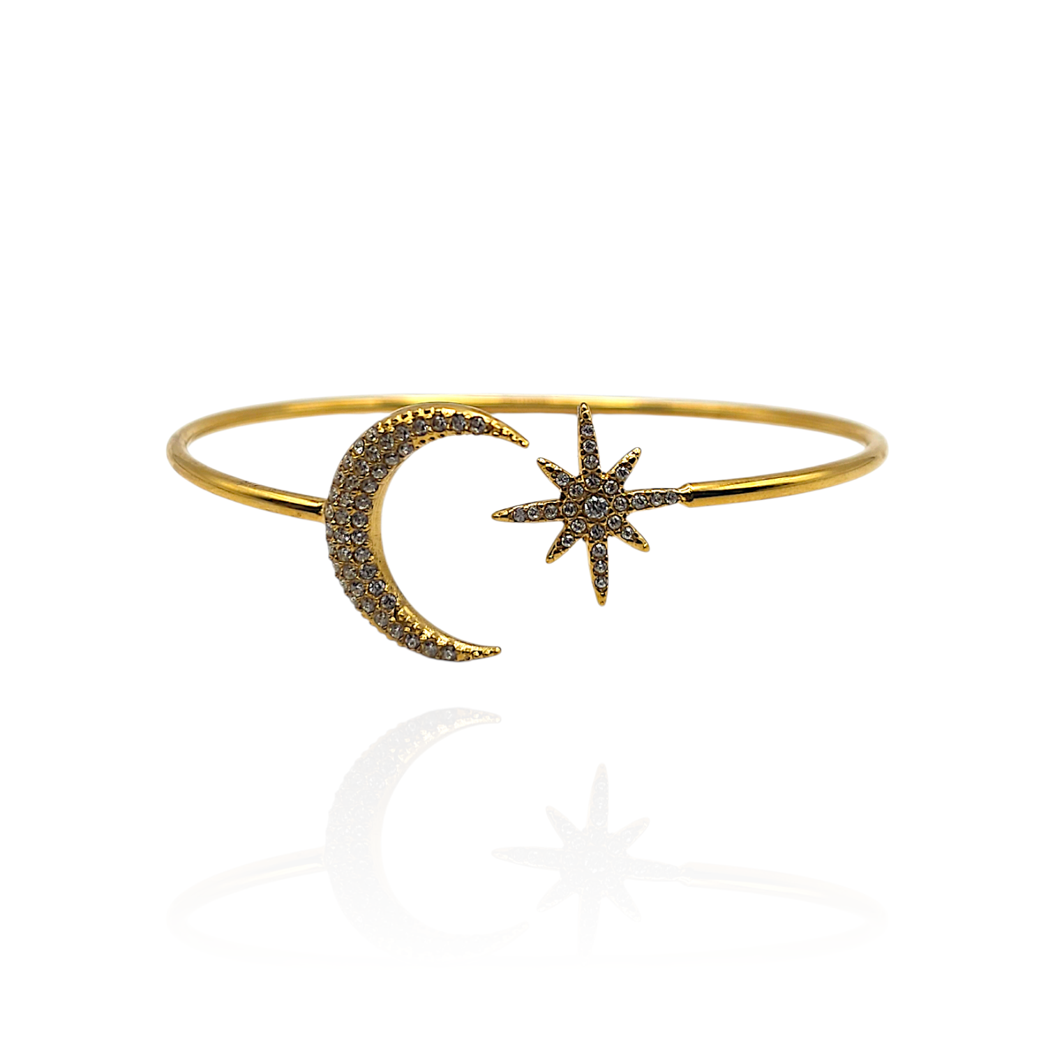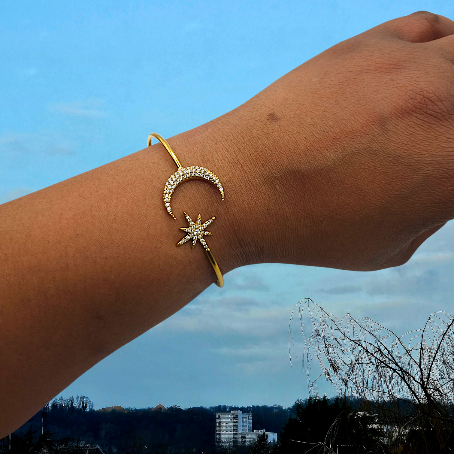 Jonc ajustable ALVA aux motifs étoile et lune, sublimé par un pavé de zircon étincelant. Design délicat et intemporel qui s'adapte à votre poignet pour un port confortable au quotidien.