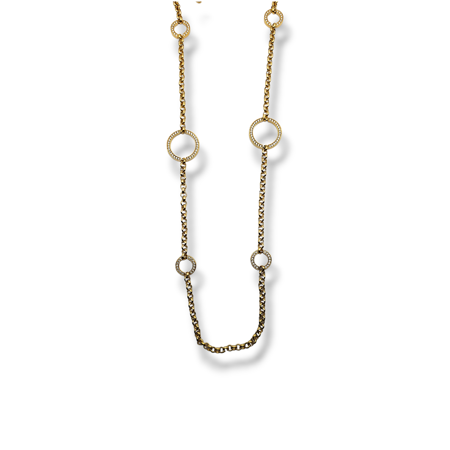 Sautoir NOVELA élégant de 80 cm de longueur, orné d'un motif de cercle pavé de zircons brillants. Ce collier allongé apporte une touche de sophistication à vos tenues quotidiennes comme aux occasions spéciales. Le design intemporel et les pierres scintillantes en font un accessoire polyvalent qui sublimera votre silhouette avec grâce et éclat.