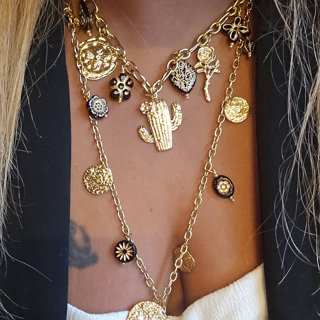 Découvrez le collier Gwen, un bijou en acier inoxydable orné de multiples breloques élégantes. Avec sa longueur ajustable de 45 à 50 cm, il s’adapte parfaitement à votre style et à toutes vos tenues. Sa conception en acier inoxydable garantit une résistance durable et une brillance constante, pour un accessoire à la fois tendance et fiable. Apportez une touche unique à votre look grâce à ce collier polyvalent qui séduira par son charme et sa robustesse.