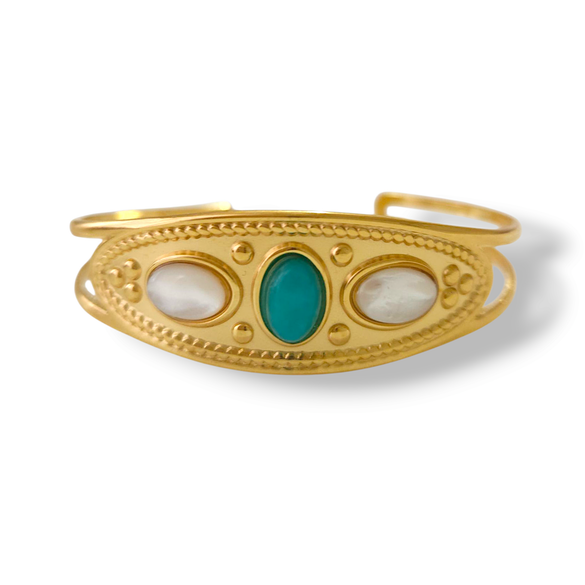 Laissez-vous séduire par l’élégance naturelle de ce bracelet jonc ajustable, orné de trois pierres fines : une aventurine centrale, encadrée de deux pierres de lune aux reflets nacrés et envoûtants. Son design ouvert et son ajustement facile en font un bijou à la fois chic et confortable.